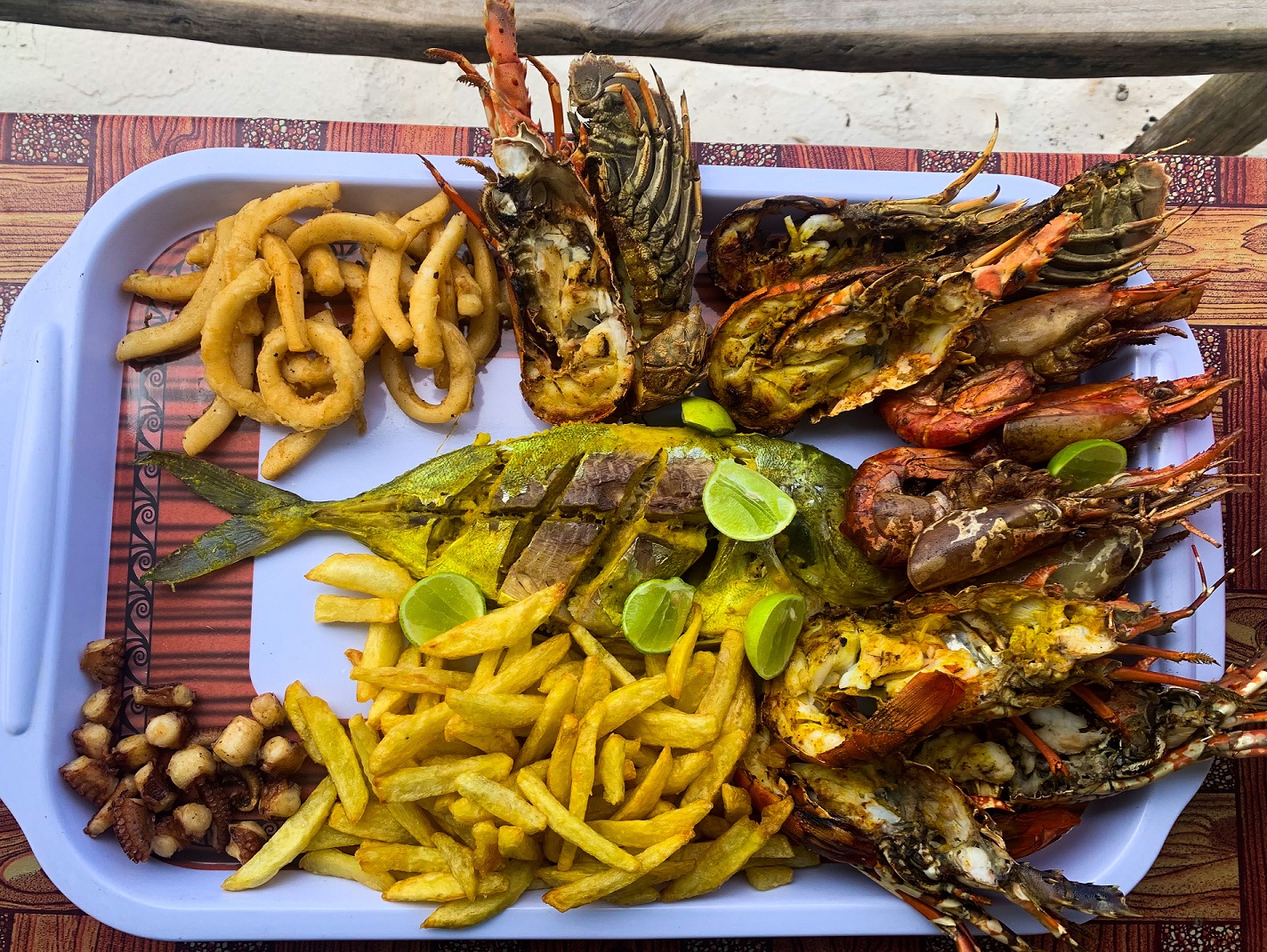 Though we were back in our hotel before the sun was fully down, we had just enough time to sit down to enjoy the catch of the day. As we sat on a bench on the beach, we waited as a cook prepared our meal on a beachside grill. Soon enough, we were handed a plastic platter full of lobsters, prawns, fish, squid, octopus, and fries, along with coconut rice and a spiced tomato sauce filled with vegetables that they simply referred to as ‘sauce’. Even for us – not the biggest fans of seafood – this was a meal of undeniable quality and freshness.