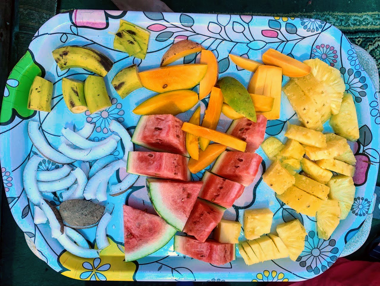 Our guides had to persuade us out of the water so we could sail on to our next stop of the day. But luckily for us, what they had in store even before we made our next stop was worth it: as we moved away from the lagoons, one of the guides took out a knife and began cutting up fresh fruit. There was mango, coconut, banana, watermelon, and pineapple. Assuming he was simply preparing himself a snack, we thought nothing of it.