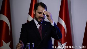 Waziri wa fedha wa Uturuki, Berat Albayrak akihutubia mkutano wa waandishi habari kuhusu ruwaza mpya ya uchumi wa nchi katika kasri la Dolmabahce mjini Istanbul, Agosti 10,2018.