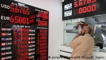 Mwanaume akiangalia viwango vya ubadilishanaji fedha nje ya duka mjini Istanbul, Ijumaa Agosti 10, 2018. Sarafu ya Lira iliporomoka thamani yake baada ya Rais wa Marekani Donald Trump kutangaza viwango vipya vya kodi kwenye bidhaa za Uturuki.