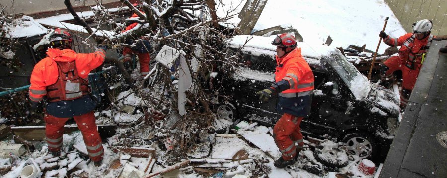 A man climbs out the window of his heavily damaged home Monday, March 14, in Yotsukura, Japan, three days after a giant quake and tsunami struck the country's northeastern coast.
