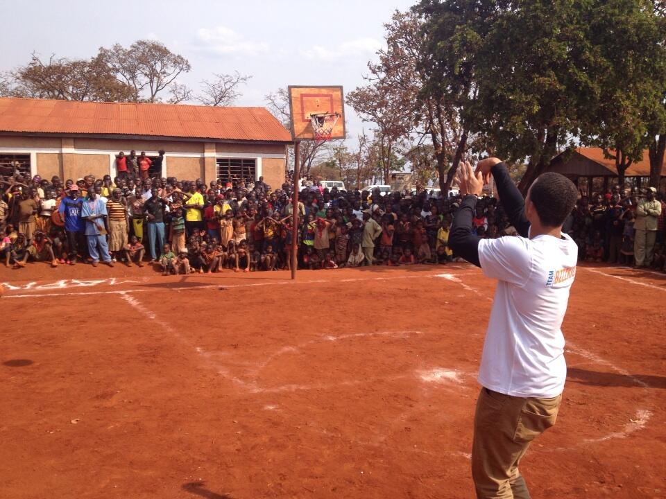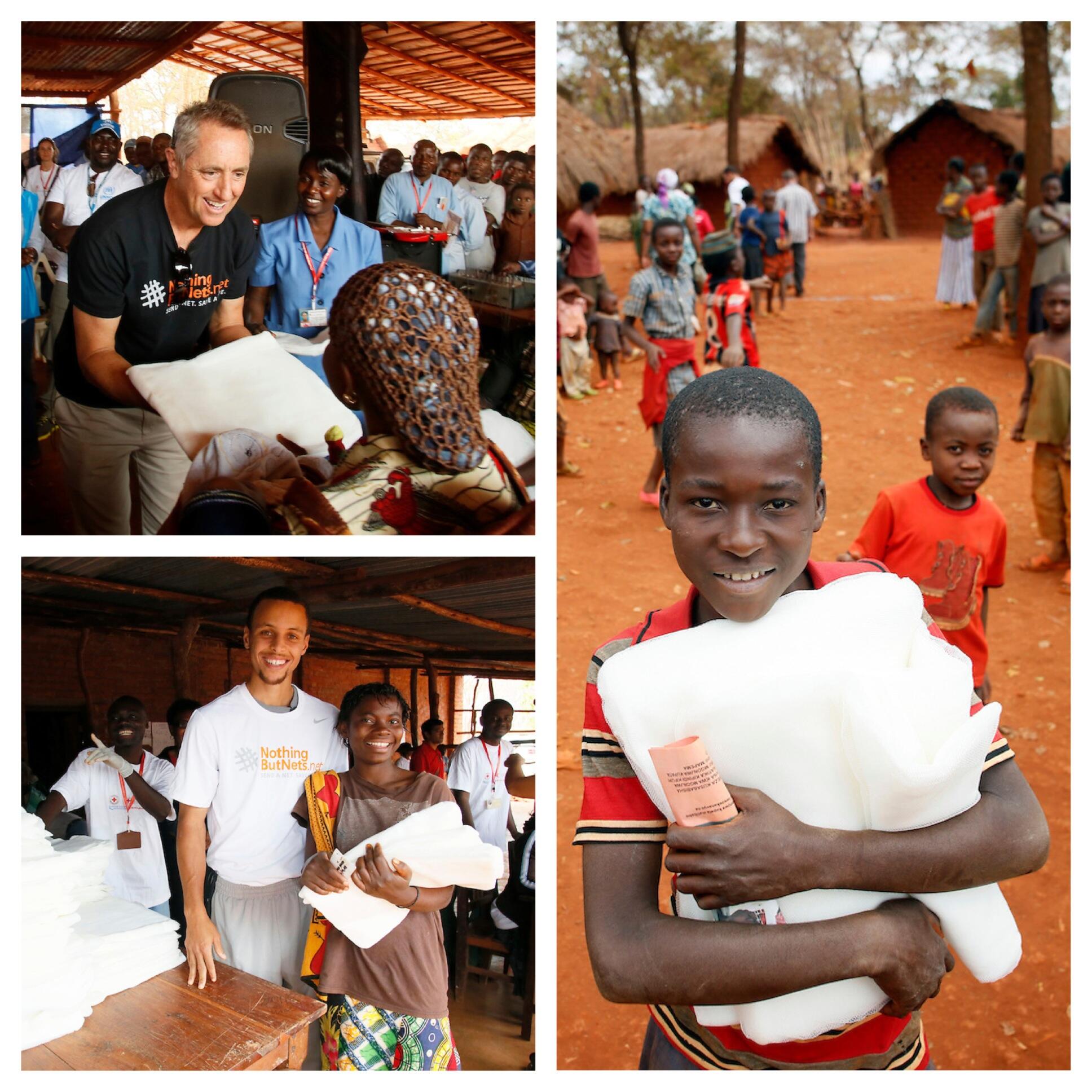 NBA superstar Stephen Curry, left, and Tanzania-born NBA player Hasheem Thabeet, right, join young basketball players in Dar es Salaam, Tanzania, August 1, 2013. Curry, of the Golden State Warriors, delivered anti-malaria bed nets to participants in a Tanzania Basketball Federation clinic as part of his work as a Champion for the United Nations Foundation's Nothing But Nets campaign, in partnership with the NBA. (Insider Images/Stuart Ramson for UN Foundation)